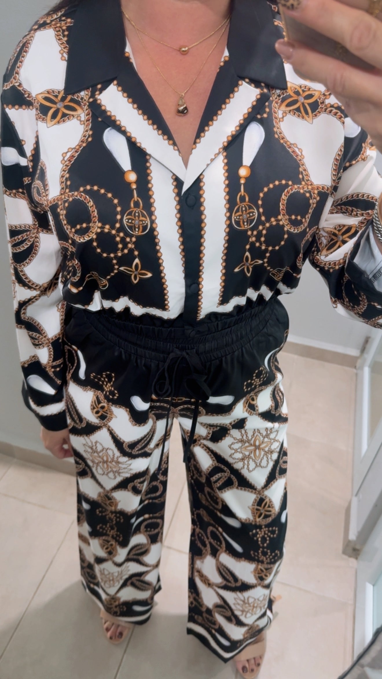 Set de dos piezas con estampado barroco en negro y dorado. Top cropped con elástico en la cintura y pantalón wide leg con pretina ajustable. Un look chic y elegante, ideal para salir con estilo sin perder comodidad.