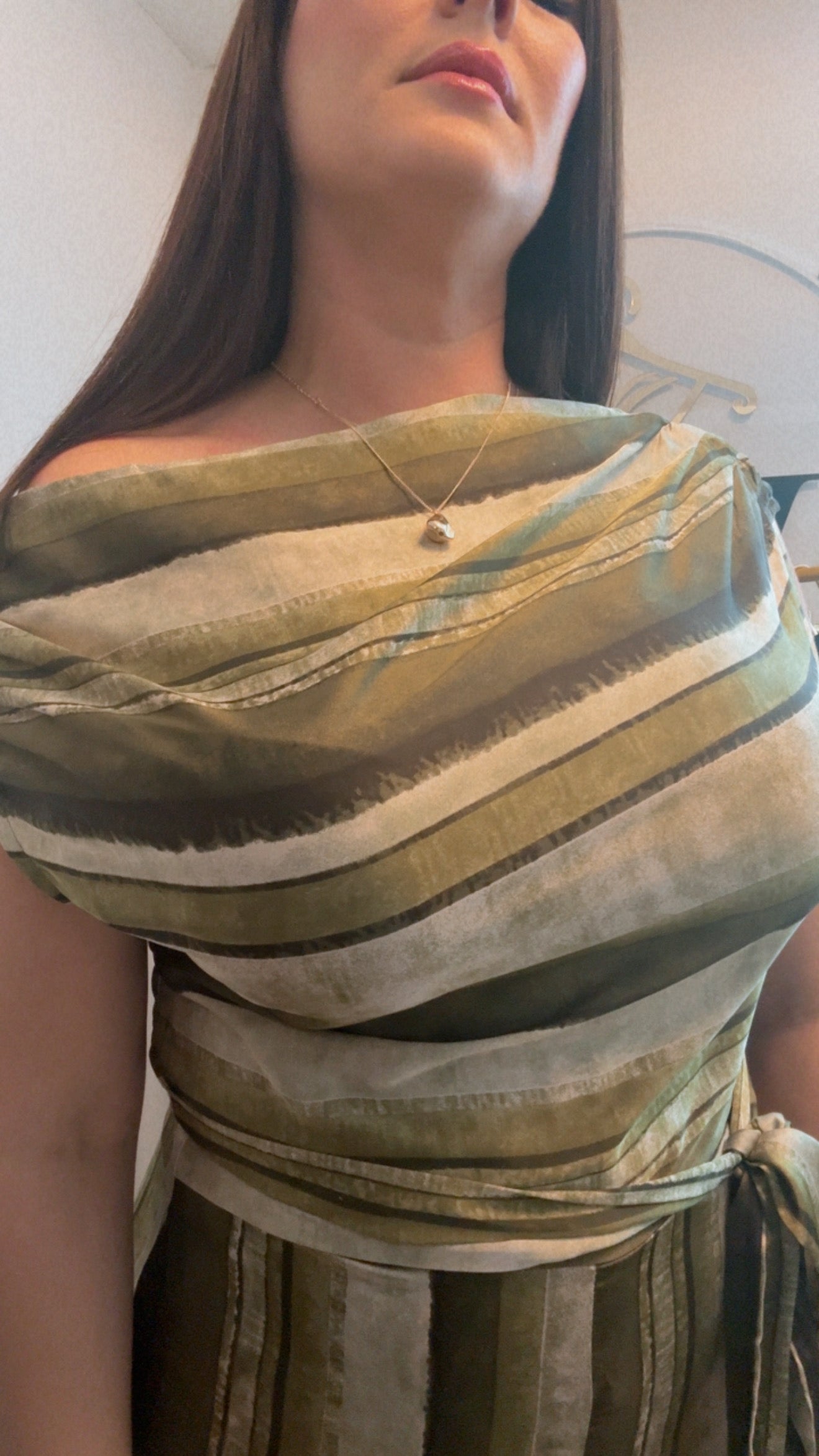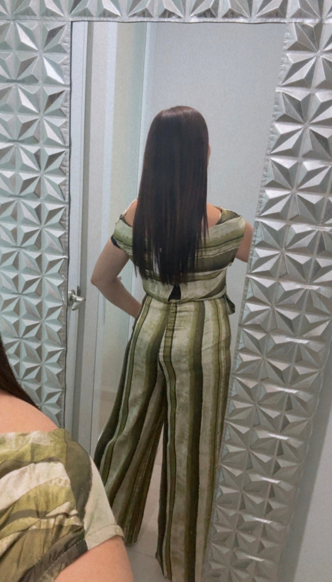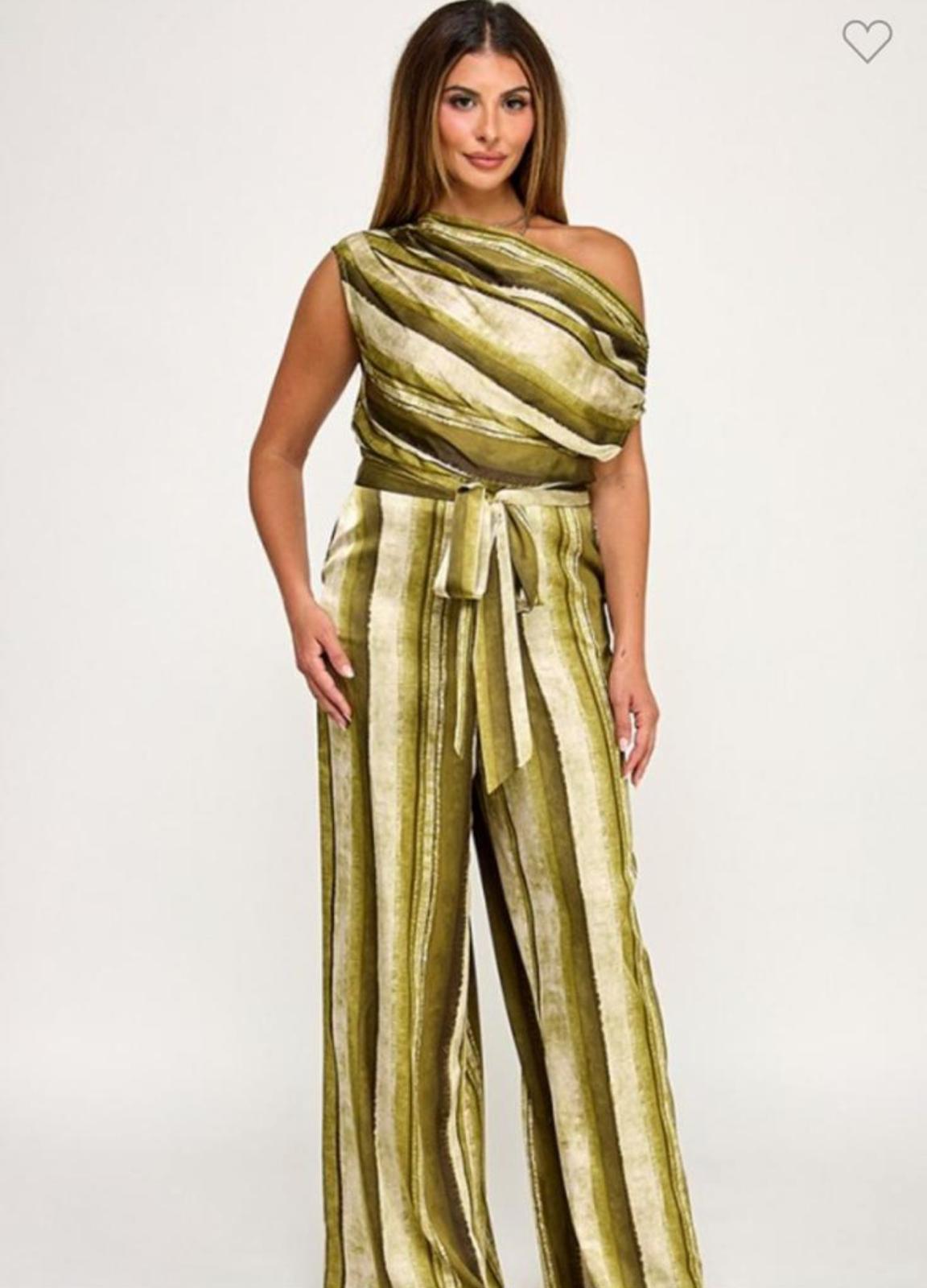 Jumpsuit con diseño de rayas en tonos verdes y beige. Top asimétrico de un solo hombro con caída elegante y área de pantalón wide leg con lazo en la cintura que estiliza la silueta. Moderno, fresco y sofisticado, ideal para destacar en cualquier ocasión.
