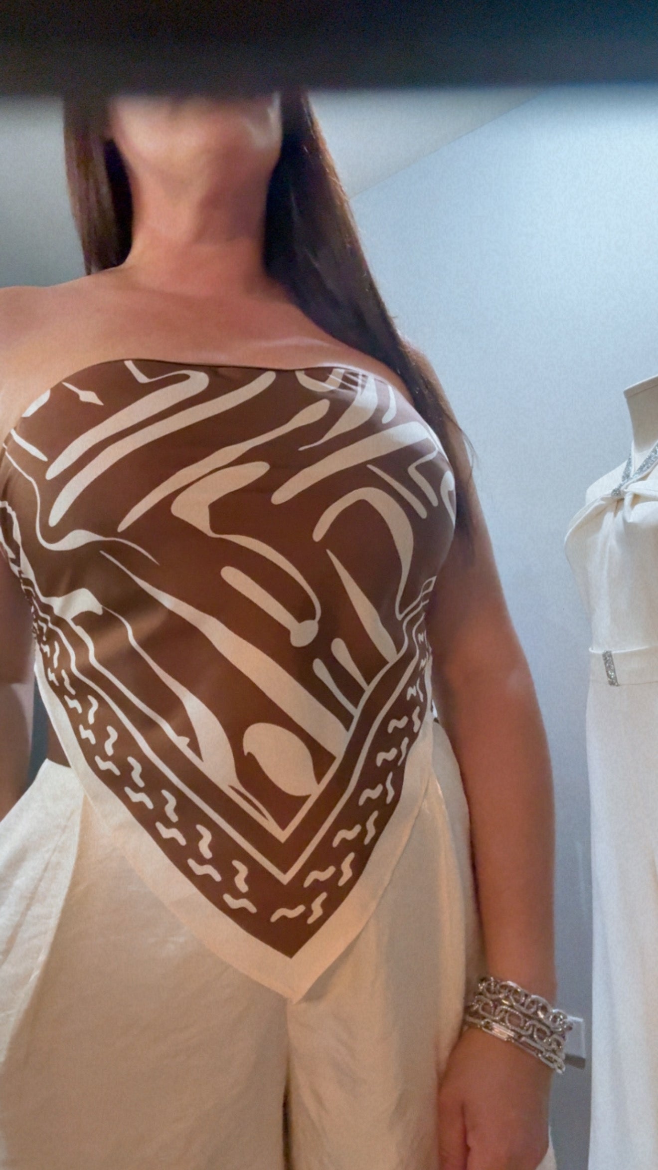 Un toque de elegancia con estilo moderno. Este top tipo pañuelo en satín combina diseño y comodidad con su parte trasera elástica que se ajusta perfectamente al cuerpo. Su print geométrico en tonos tierra lo convierte en una pieza versátil para crear looks casuales o más sofisticados.